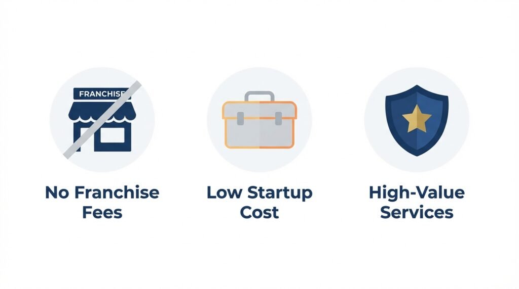 There are no franchise fees, no royalties, no territory buy-ins, and no long-term lock-in contracts.